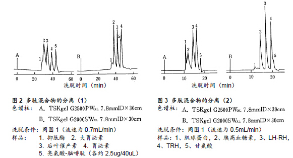 一般情況下,采用GFC法分離多肽所使用的填充劑多為TSKgel的SW硅膠型填料而非TSKgel的PW樹脂型填料。本文中將針對(duì)這些填充劑(TSKgel G2000SWXL以及TSKgel G2500PWXL)在多肽分離的應(yīng)用上進(jìn)行探討。
