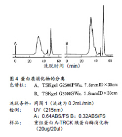圖4所示為分離基因重組ProteinA的TRCK-胰蛋白酶消化物的實(shí)例。樣品中含有與蛋白質(zhì)消化物分子量不同的各類多肽。如上所示,由于TSKgel G2000SWXL色譜柱的分離范圍較寬,其分離效果也更好。(該樣品通過RPC分析的結(jié)果,可觀察到約有60種多肽峰在RPC下被檢測(cè)到)。