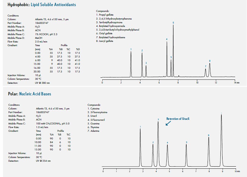 在對(duì)于極性化合物的反相HPLC保留與分離方面,Atlantis T3為極性化合物保留設(shè)立了行業(yè)標(biāo)準(zhǔn)。Atlantis T3色譜柱是通用的、硅膠反相C18柱,它不僅能保留和分離水溶性的極性小分子有機(jī)化合物,而且還為這項(xiàng)優(yōu)異能力提供了更寬的pH操作范圍。對(duì)于反相應(yīng)用,要開發(fā)極性(和非極性)化合物的保留分離方法時(shí),Atlantis T3應(yīng)該作為第一選擇。